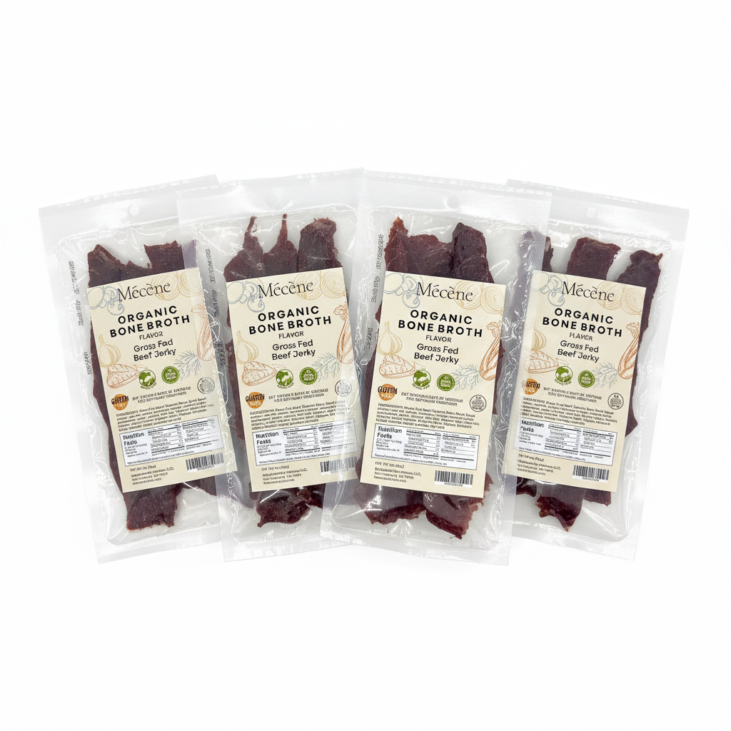 The Mécène Organic Bone Broth Grass-Fed Beef Jerky is 100% organic and crafted in the USA with globally sourced ingredients in an FDA-registered, cGMP-compliant, and third-party tested facility.